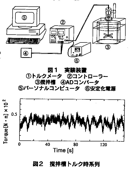 撹拌槽内のトルクと槽内液体の流速を測定し、その周波数解析とフラクタル解析を行い、