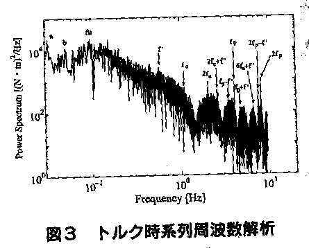 図3は図2のトルク時系列の周波数解析結果です。この図の縦横両軸は対数目盛とよばれるもので、10
