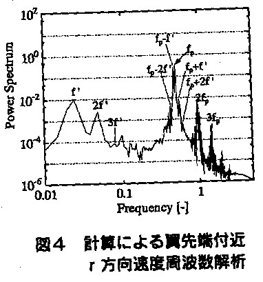 件では撹拌翼は毎秒1回転で回っており、羽根がある垂直面を通過する羽根通過周波数fp=4Hz(=s−1)、
