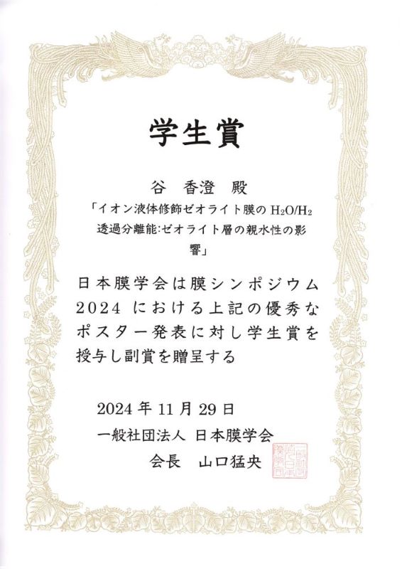 谷香澄さん(廣田G)が日本膜学会の膜シンポジウム2024で学生賞を受賞しました。(リンク)
