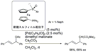 また、スルフィニル基をルイス塩基として用いる新規不斉配位子を設計し、アリル位置換反応において68%eeのエナンチオ選択性の発現に成功しました[ref 9]。