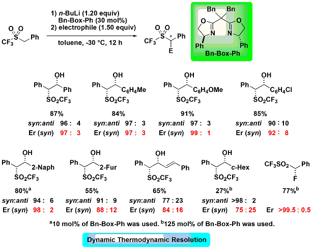 一方で、合成的に重要な化合物であるスルホンのカルボアニオンを用いるエナンチオ選択的反応は、これまでに高いエナンチオ選択性が得られた例はありませんでした。そこで、スルホンのカルボアニオンを用いるエナンチオ選択的求電子付加反応を検討した所、不斉配位子としてビスオキサゾリン類を用いると高エナンチオ選択的に反応が進行することが明らかとなりました。