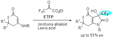 当研究室ではトリフルオロメチル(CF3)基を代表とするフルオロアルキル化反応の開発を行っています。特に不斉CF3化反応の開発は当研究室で長年取り組んできた研究テーマでもあり,シンコナアルカロイド由来の相関移動触媒を利用した選択的CF3化反応を開発しています。ケトンやアゾメチンイミン,イソキサゾール等,様々な基質に対して高選択的なCF3化反応を達成しています。