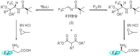 F3TBSI((SS)-N-tert-butanesulfinyl (3,3,3)-trifluoroacetaldimine)はキラル補助基をもつビルディングブロック素材です。当研究室ではF3TBSIとマロン酸エステルから含フッ素βアミノ酸を合成することに成功しています。他のキラル源を一切用いずに塩基を変えるだけで立体の異なる含フッ素βアミノ酸を作り分けることができます。