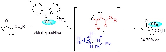 求電子的な不斉CF3化反応としては,ジベンゾスルホニウム塩型試薬とキラルグアニジンを用いた不斉CF3化反応を達成しています。キラルグアニジンが塩基として基質であるβ-ケトエステルのプロトンを引き抜くと同時に,複数の水素結合によって不斉場を形成し,そこにCF3化試薬が作用することで不斉四級炭素を構築します。