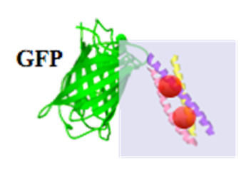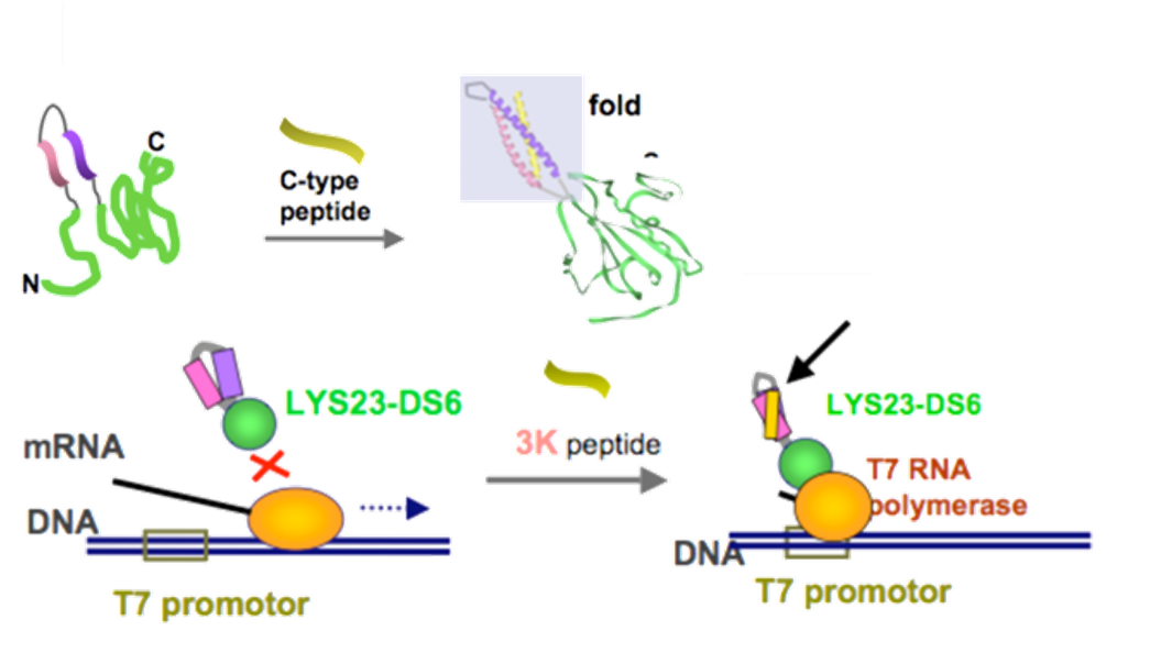 外部刺激(温度、光、イオン、薬剤などの小分子、ペプチド、蛋白質、DNA、RNAなどの核酸等)に応答し、自身の保持する生理機能が変化する蛋白質を開発することは、「生体内で意図する刺激を感知可能なセンサー蛋白質の構築」、あるいは生体内での「特定の遺伝子回路に対するturn-on、turn-offを可能とする人工エフェクター分子の開発」などへの利用が期待され、特にケミカルバイオロジーの研究分野における分子ツールとして有用です。このような分子の基本的な設計指針は、例えばセンサー蛋白質を設計するためであれば、外部刺激を感知する機能を持つ蛋白質と、酵素活性や蛍光発光などの(通常の検出器での検出が容易な)物理信号を発する蛋白質を適切に組み合わせたハイブリッド蛋白質を設計すれば可能となり、様々な人工蛋白質が多くの研究者によっても開発、報告されてきています。 これまでに我々の研究室では、イオンの結合や特定のペプチドとの結合により大きく立体構造の変化するデノボコイルドコイル蛋白質を、外部刺激を感知する機能を持つ蛋白質ユニットとして利用し、種々の外部刺激に応答する人工蛋白質の創成を行っております。