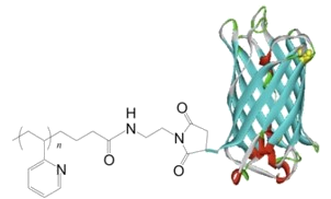 Amphiphileと名付けられました。しかし(あくまでこの研究報告を行うまでだったかもしれませんが)、それまでに報告されていたものは、蛋白質表面に疎水性の高分子を付加(あるいはGraft-On-to法にて蛋白質表面からモノマーを重合し伸ばす)したものが偶発的に形成する会合体について検討しているものが主でした。そこで本研究では、pH変化に依存し疎水性-親水性の変化するポリ2−ビニルピリジン(p2VP)の性質に着目し、弱酸性条件下で水溶性のp2VPを蛋白質に導入しつつ、その後の中和によりp2VPユニットを疎水性に変化させる過程をコントロールすることで、蛋白質集合体の形成制御を試みました。