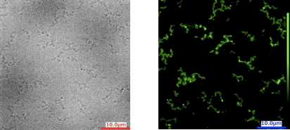 | 図3GFPナノチューブのTEM画像(左)とSEM画像(右) | 図4GFPナノチューブの位相差顕微鏡画像(左)と 蛍光顕微鏡画像(右) |